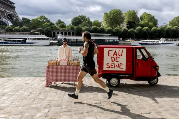 Przed Igrzyskami Olimpijskimi w 2024 r. artysta uliczny James Colomina założył nad Sekwaną instalację, w której sprzedawał butelkowaną wodę z rzeki, jak na ironię, określanej jako silnie zanieczyszczona.OLYMPIA DE MAISMONT/AFP za pośrednictwem Getty Images