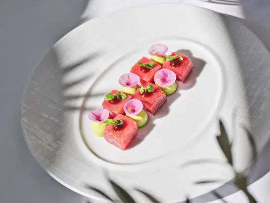 Mam wrażenie, że wcześniej menu w The Restaurant było zbyt pomieszane, co niekoniecznie pasowało zwłaszcza do tego obiektu – mówi Garcia. Nowy kierunek i menu mają nawiązywać do atmosfery Hotelu Bel-Air i tego, co reprezentuje ten ikoniczny cel, czyli ponadczasowego przepychu. Zastępca szefa kuchni Garcii, Gel Zara, który pracuje w obiekcie od blisko 11 lat, również jest zachwycony zmianami wprowadzanymi w hotelu Bel-Air. Mamy tak wielu stałych bywalców, którzy traktują Hotel Bel-Air jak drugi dom i bardzo się cieszę, że mogą doświadczyć tego zwrotu w programie kulinarnym – mówi Zara. Menu pozostaje spójne od ponad dziesięciu lat, ale teraz wydaje się, że restauracja ma bardziej przemyślaną tożsamość, zakorzenioną w wyśmienitej kuchni i klasycznych wpływach francuskich.