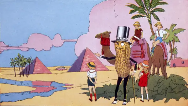 Plantatorzy użyli kiedyś książki promocyjnej wydanej około 1920 roku, aby zilustrować światową popularność swoich produktów, przedstawiając pana Peanut w Egipcie w pobliżu piramid, Tower of London, w Chinach i innych miejscach.Transcendentalna grafika/obrazy Getty